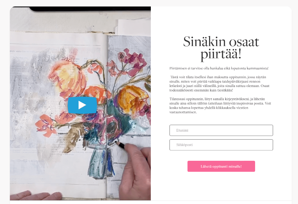 Voit tilata tästä alta suoraan sähköpostiisi itsellesi videon, jossa näytän sinulle kädestä pitäen, kuinka pääset alkuun rennossa piirtämisessä. KLIKKAA KUVAA 👇🏻